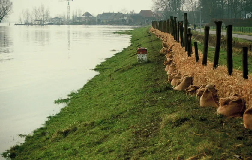 Bij een korte en spitse hoogwaterpiek omgeslagen opening van zandzakken tegen stromingsrichting in plaatsen; bij een onzekere hoogwaterprognose beter omgeslagen openingskant naar het water toe plaatsen.