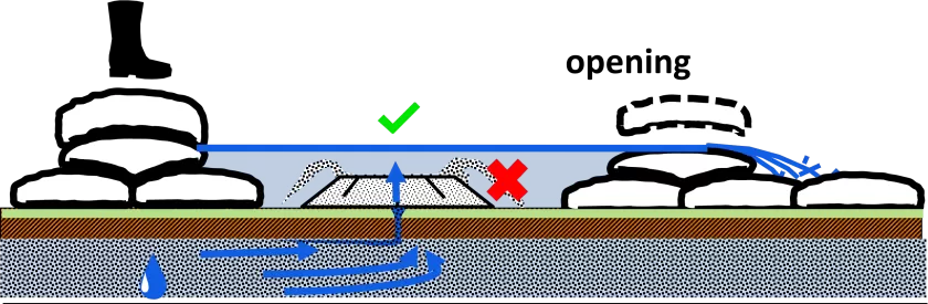 Het gebruik van een waterdoorlatend doek/geotextiel onder de basis van de opkisting is zeer diskutabel. De volgende argumenten spreken tegen het gebruik ervan: